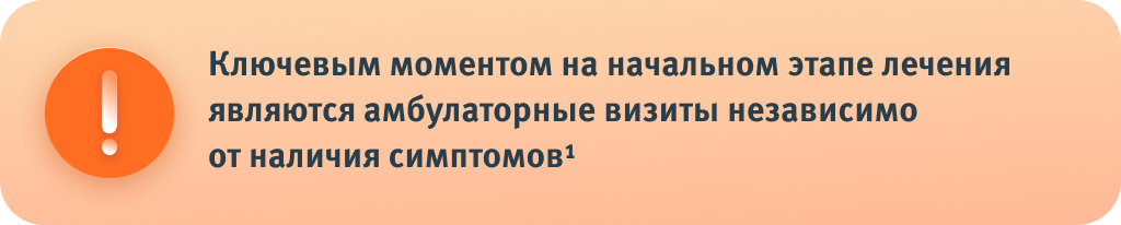 Так же стоит установить частоту визитов. В начале лечения — 1 раз в 1-2 месяца, в дальнейшем можно уменьшить частоту визитов в зависимости от динамики симптомов1.