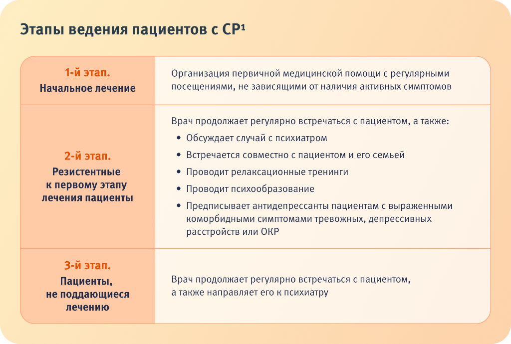 Не все пациенты с СР сразу готовы к лечению. Некоторые отказываются признать наличие психического расстройства и не хотят сотрудничать с врачами, которые не разделяют их мнение. В таких случаях важно придерживаться долгосрочной стратегии. Показывайте пациенту, что вы открыты для взаимодействия и начнете лечение, когда тот будет готов1.