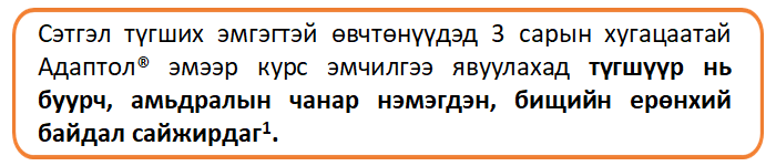 Адаптол® — үр дүнтэй, аюулгүй тайвшруулах эм, ялангуяа бие махбодын өвчний хам шинжтэй өвчтөнүүдэд онцгой тохиромжтой. Зохимж сайтай, донтол хамаарал үүсгэдэггүй, мөн бусад эм бэлдмэлтэй хавсрах хэрэглэх боломжтой тул сэтгэл түгших эмгэгийн эмчилгээнд ухаалаг сонголт болно.